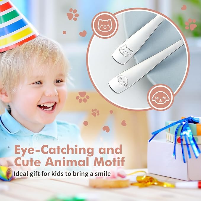 - ENGAGING MEALTIMES: Our kids silverware set embossed with a mirror-polished finish and adorable animal motifs. Your child will be excited to dine with a kitten on the spoon and a pup on the fork, turning mealtime into a fun and engaging experience
