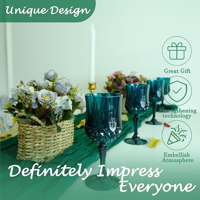 - 🍷🍷🍷【Product Description】 This set includes 24 retro-style dark green party plastic wine glasses, providing ample quantity to meet your daily use and replacement needs. The elegant and sophisticated design makes your wedding reception unique