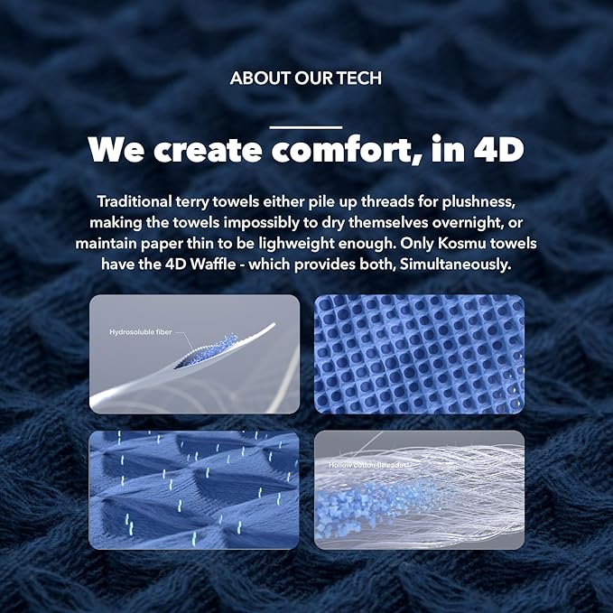 - šØGet bone dry every A.M.: While the waffle structure intrinsically maximizes surface exposure for airflow for guaranteed breathability, allowing the towel to dry itself out quickly, we have fundamentally improved the performance of Kosmu Towel with advanced science and technology.