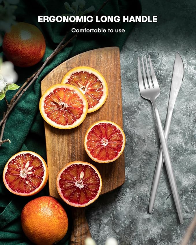 - Heavy Duty Stainless Steel: The cutlery set is made of food-grade thickened stainless steel, so don't have to worry about its quality and can use it with confidence. The extended round handle conforms to the principles of ergonomics, ensuring that every touch is a redefinition of comfort, and long-term use is burden-free. What's more worth mentioning is that the heavy-duty material brings a stable grip experience, which makes people love it