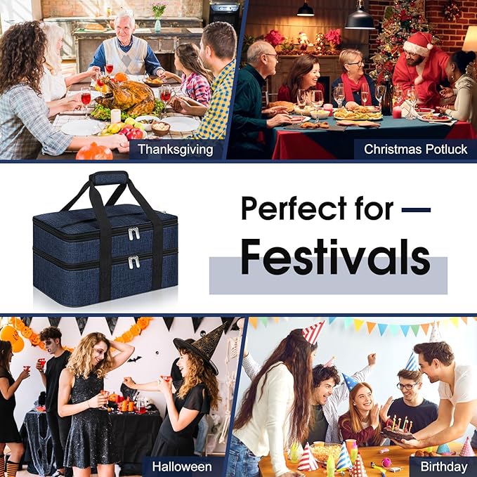 Double Insulated Casserole Carrier, Portable Casserole Carrier for Hot or Cold Food Lunch Tote Warmer or Cooler Bag, Lasagna Lunch Bag for Potluck Parties- Fits 9" x 13" Baking Dish-Navy blue