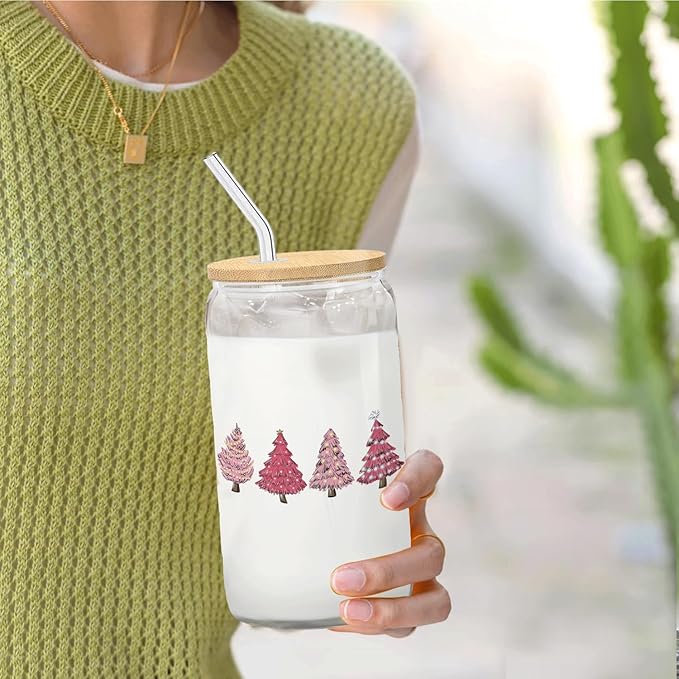 Pink Christmas Tree Decor Coffee Cup Glass With Lid And Straws 14oz,Xmas Tree Drinking Glasses Coffee Cups Water Bottles Gift For Women Kids Men