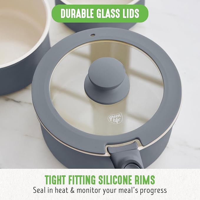 - GLASS LIDS WITH SILICONE RIMS: Each durable glass lid features a tight-fitting silicone rim to seal in heat while you watch from above.