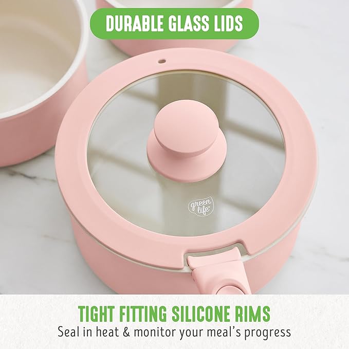 GreenLife 10 Piece Nonstick Pots & Pans Set, Detachable Handle & Stackable Cookware Set, Non Toxic PFAS-Free Skillets, Induction Kitchen Pans, Space Saving, Serving Bowls, Oven Safe, Light Pink