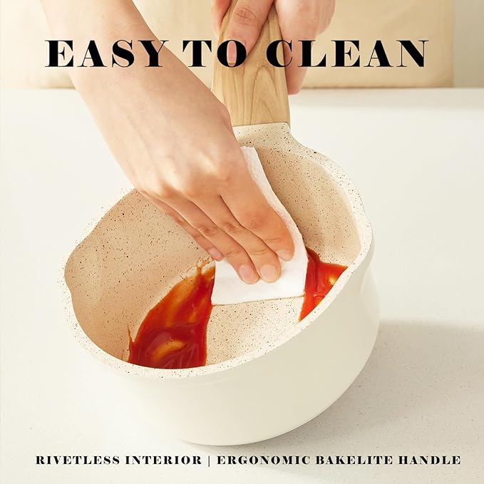 - The cookware set is ergonomically designed ergonomic bakelite handle and is comfortable to grip & easy to lift and pour. All-in-one design. Rivetless interior to prevent food from sticking. Just wipe the pan with a paper towel or rinse the pot with water, which makes cooking not only easier but also more enjoyable.