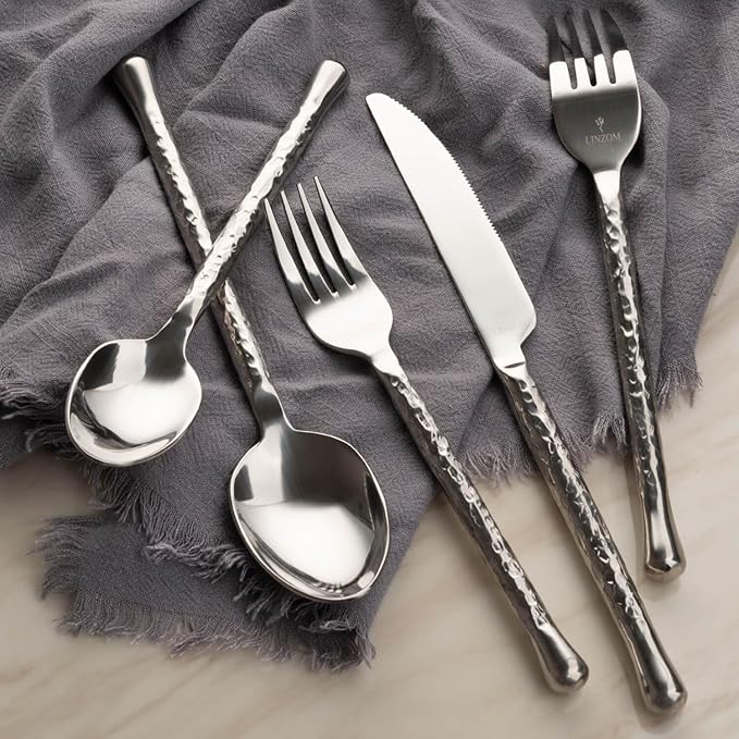 - WHY CHOOSE IT: Our silverware set goes through an intense forging process, with high-temperature heating and hammer strikes, to guarantee a dense and sturdy material. The handle features patterns that have been hammered by artisans, with the tail end designed in a unique pearl-drop shape. This design is the perfect combination of rustic elegance and modern beauty. It also reflects dazzling and brilliant light from various angles, creating a stunning visual effect that will take your breath away!