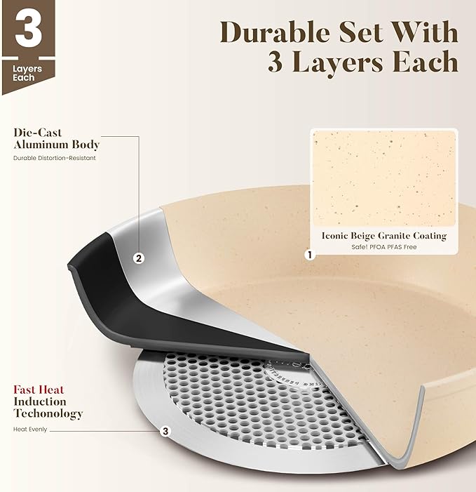 - 𝙃𝙚𝙖𝙡𝙩𝙝𝙮 𝘾𝙤𝙤𝙠𝙬𝙖𝙧𝙚 𝙎𝙚𝙩 𝙬𝙞𝙩𝙝 𝙏𝙤𝙭𝙞𝙣-𝙁𝙧𝙚𝙚: Made of natural granite, our kitchen cookware set is Teflon-free and guarantees no PFAS, PTFE, PFOA, lead, or cadmium.Ideal choice for safety-conscious families, especially those with babies