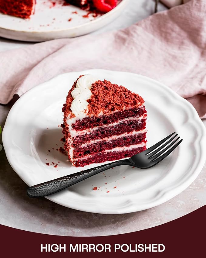 - High-quality Stainless Steel - The black cutlery set is made of high-quality stainless steel, with high grade forging technology. Double-sided hammered handle not only beautiful, but also add a calm texture. The appropriate weight and heavy-duty structure ensure that the cutlery can withstand daily use and is not easy to bend or break. EUIRIO cutlery has both texture and weight. Every time you hold it, it is a recognition of its quality.
