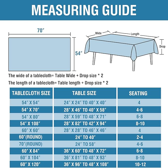- MULTIPLE APPLICATION: Our tablecloths create the perfect look for a variety of happy occasions— perfect for everyday use, party, holidays, catering, cafes, special occasions, dinners, brunches, potlucks, BBQ's, buffets, baby showers, indoor and outdoor use, weddings and more