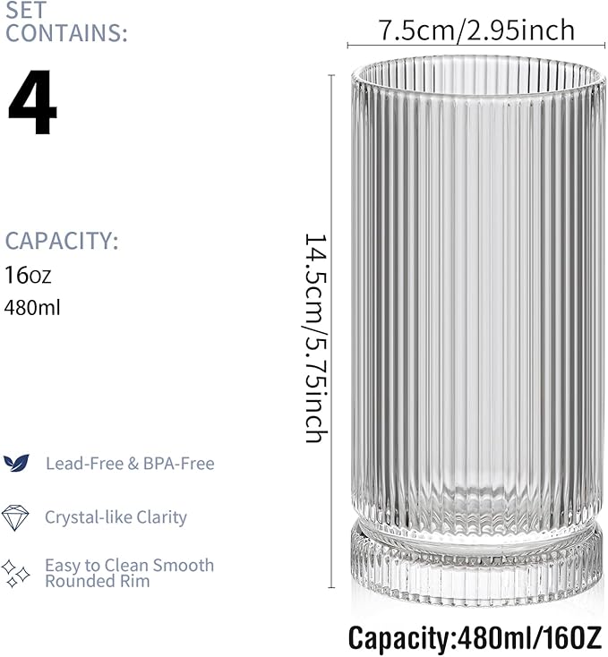 16oz Ribbed Glassware, Vintage Drinking Glasses Set of 4, Cocktail Glass Cups, Elegant Tom Collins Glasses, Highball Ribbed Glasses Ideal for Water, Iced Coffee, Juice, Beer, Milk