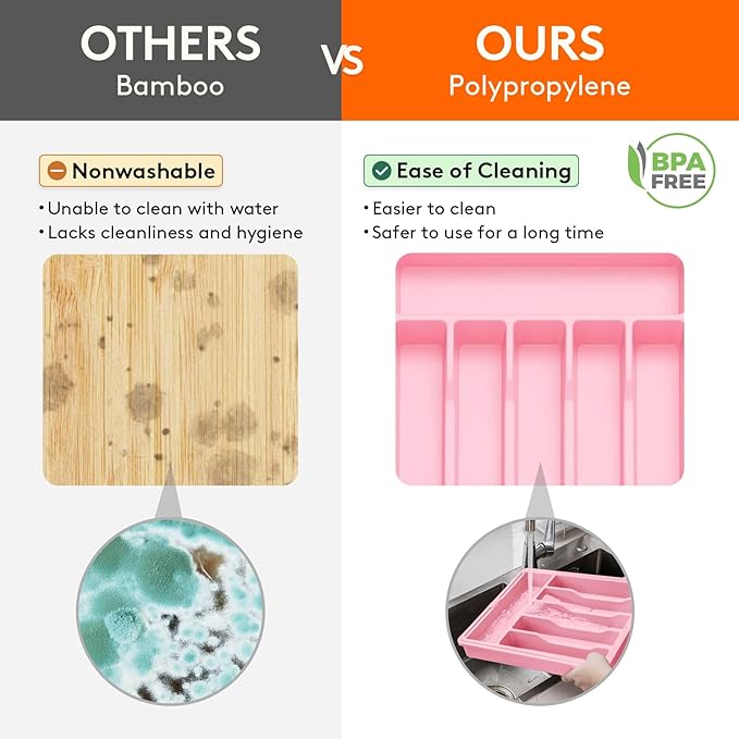 - Robust and Safe: This kitchen drawer organizer is crafted from premium PP material, BPA-free and built to last. It ensures your silverware is stored in a healthy, safe environment for worry-free use