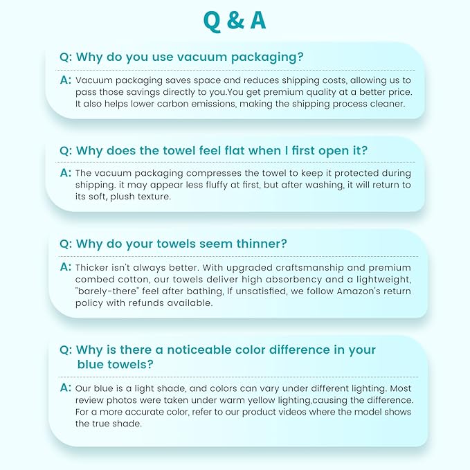 - 【Easy Care】Vacuum packaging ensures the towels remain clean. It is recommended to wash before first use to restore compressed fibers and fluffiness. Additionally, the towels are machine washable, but for maintaining the best condition, it is advised to avoid using fabric softeners and bleach