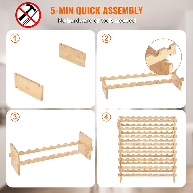 - Hassle-Free Assembly: Assembling our freestanding wine rack is a breeze, taking just 5 minutes with no tools, nails, or screws required. It's very simple, but please make sure to check that all parts are correctly aligned before assembly. If you need to move the rack, be sure to remove the bottles first.