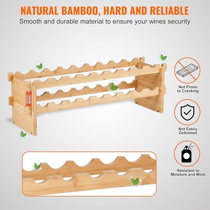 - Natural Bamboo Wood: Our wine storage rack is made from high-quality bamboo, which is smooth, crack-resistant, and less likely to absorb moisture or mold. The natural bamboo has excellent resilience and supports wine bottles perfectly without wobbling.