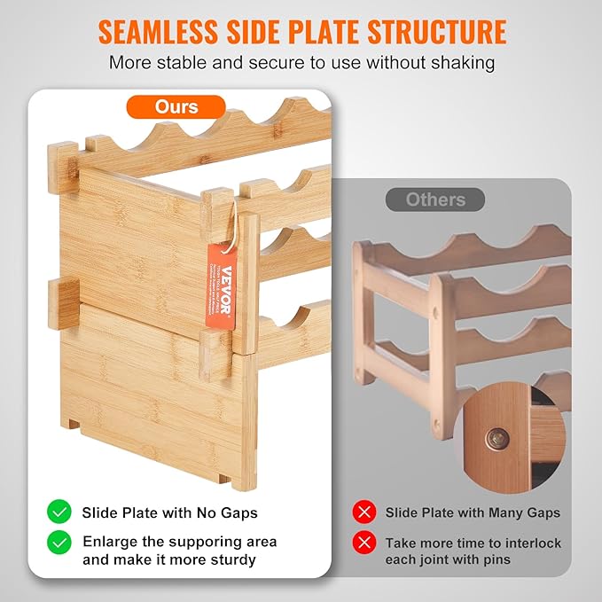 - Sturdy Construction: Our wood wine rack is very sturdy, with upgraded side panels that eliminate gaps and expand the support area. This design ensures the rack's stability, preventing wobbling, tilting, or falling, and providing excellent safety for your bottles over long-term use.