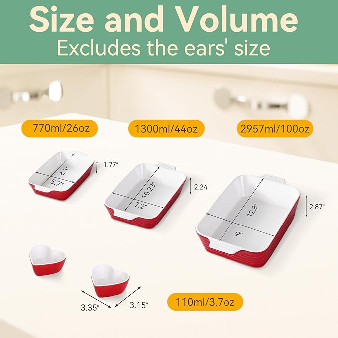 - Versatile 5-Piece Set--This casserole dishes includes 3 baking pans in different sizes, Large: 12.8*9*2.87inch, Medium: 10.23*7.2*2.24inch, Small: 8.1*5.7*1.77inch.(excludes the ears' size) and 2 heart-shaped ramekins. High-quality ceramic casserole dish set, made of safe materials, these are suitable for making spaghetti, lasagna, bread, casseroles, chicken, roasting, beef, potatoes, vegetables, storing food and more. Small ramekins are designed for souffle, crème brûlée, custards, desserts and more.