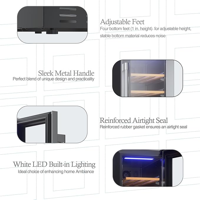 - Silent Compressor: The wine cooler is equipped with an efficient compressor cooling system and an internal circulation fan to ensure even cooling without any hot spots. It reaches the set temperature within one hour of operation and operates at a low 41 dB, minimizing noise and vibration to preserve the wine's flavor