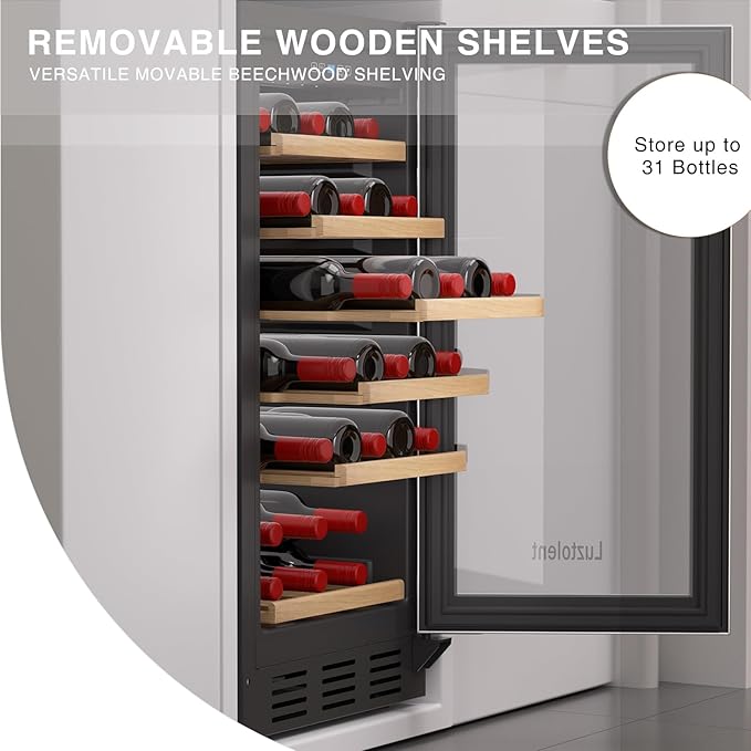 - Ideal Storage capacity: The Luztolent single-zone wine cooler has the capacity to accommodate up to 31 standard bottles, with a maximum of 5 bottles per shelf. Please note that the total capacity may vary depending on the sizes of the bottles