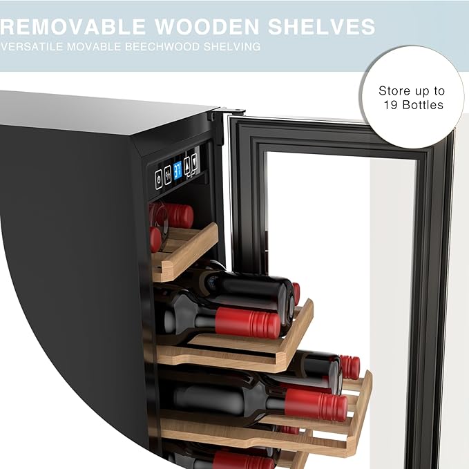 19 Bottles Wine Fridge,12 Inch Wine Cooler with Single Zone, Built-in or Under Counter,41-64°F Thermostat, LED Digital Touchscreen, Triple-Layer Tempered Glass, Wine Storage for Home