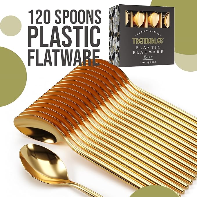 - TRENDABLES PLASTIC SILVERWARE Spoons : This Glorious Pack Of 120 Count Plastic Spoons heavy duty Contains Just What You Need To Bring Your Party To The Next Level. The Beautiful Gloss Plastic Silverware Heavy Duty Gold Utensils Set Will Not Disappoint You or Wedding Guest