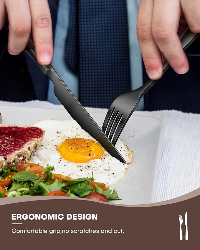 - Heavy-Duty Ergonomic Design: Our heavy utensil Set design with ergonomics in mind, use thickened food-grade superior sturdy stainless steel that offers durability, while exceptional balance weight to a comfortable grip. Easy use this black flatware set enjoyable meals without worry!