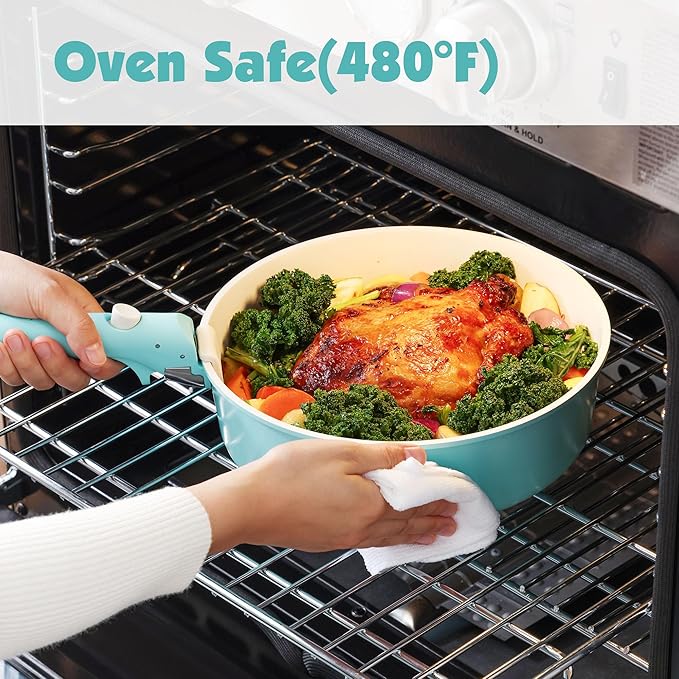 SENSARTE 17 Piece Ceramic Pots and Pans Set, Nonstick Detachable Handle Cookware, Induction Kitchen Cookware Set with Removable Handle, Dishwasher & Oven Safe (Turquoise)