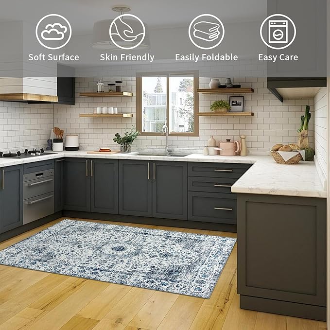 Easy-Going Boho Area Rug 3x5 Entryway Rug Washable Inside Door Mats for Home Entrance Non-Slip Vintage Small Rugs for Entry Living Room Bedroom Kitchen Bathroom Lightweight Carpet, Floral Blue Cream
