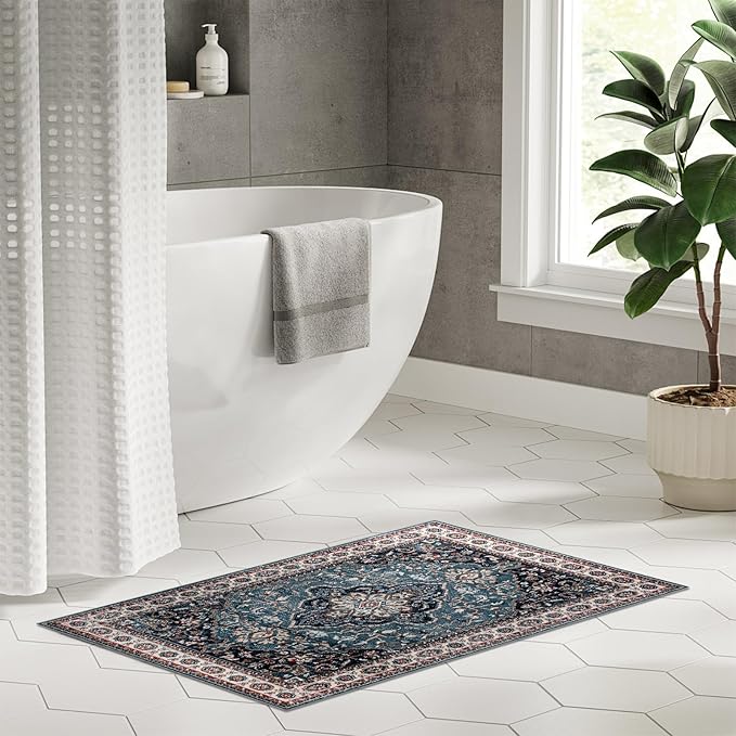 Easy-Going Area Rug 2x3 Washable Medallion Distressed Entryway Rugs Front Door Mat Indoor Entrance Non-Slip Vintage Retro Small Entry Rug for Bedroom Kitchen Bathroom Lightweight Carpet, Teal Brick