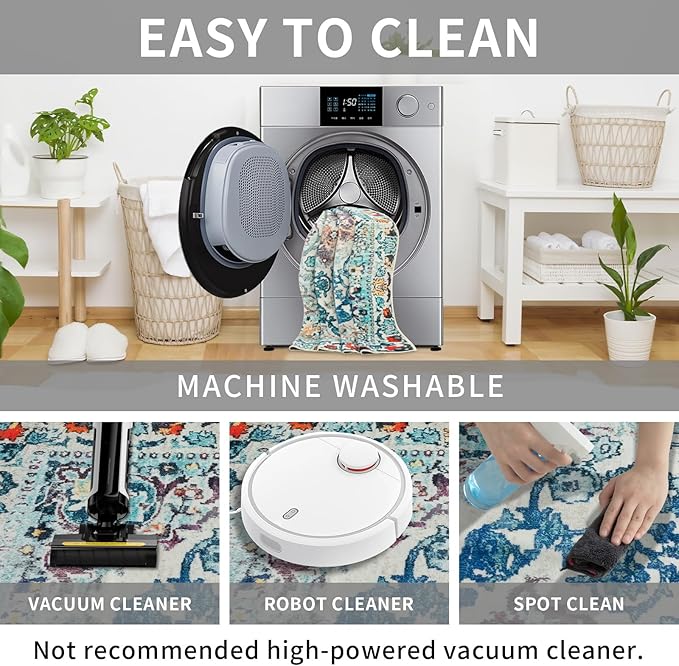 - EASY CARE & MAINTENANCE: Cleaning is effortless with this machine-washable rug. For minor stains, simply spot clean with a damp cloth. Daily dust and debris can be quickly removed with a vacuum or robot cleaner in low-powered mode. For deeper cleaning, toss the rug in the washing machine with mild detergent and air dry to preserve its vibrant colors and quality. Say goodbye to time-consuming manual cleaning!