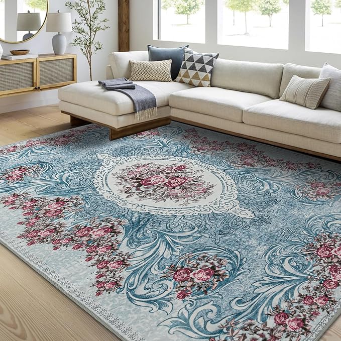 Easy-Going Area Rug 6x9 Washable Floral Rugs for Living Room Non-Slip Bedroom Rug Low Pile Lightweight Retro Flowers Throw Rug for Dining Room Kitchen Home Office Carpet, Teal Red