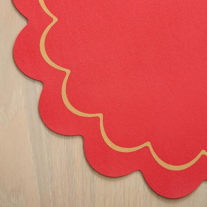 Kate Spade New York Scallop Edge Round Reversible Placemats 6-Pack Set, Imitation Leather with Metallic Print, Water Resistant, Easy Wipe Clean, Red/Gold, 15" Round
