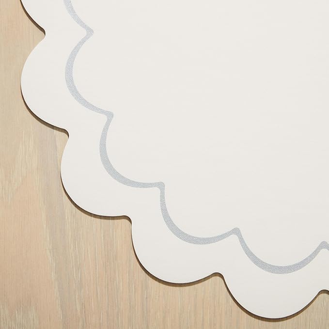 Kate Spade New York Scallop Edge Round Reversible Placemats 6-Pack Set, Imitation Leather with Metallic Print, Water Resistant, Easy Wipe Clean, White/Silver, 15" Round