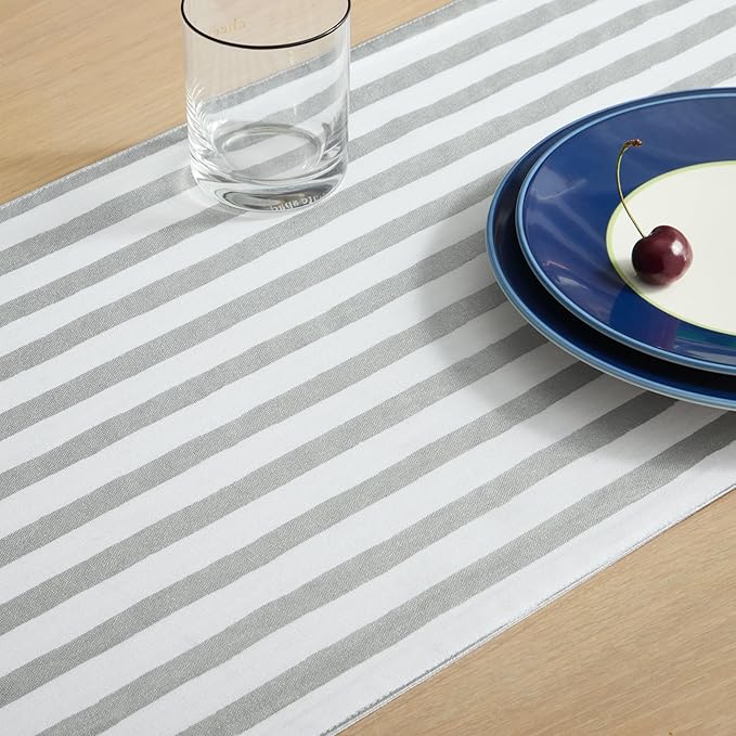 Kate Spade New York Hand Painted Shirting Stripe Reversible Table Runner, 100% Cotton with Metallic Print, Silver/White, 15"x72"
