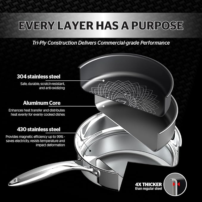 - Heats Up Quickly With Tri-Ply Stainless Steel - The unique whole body tri-ply bonded construction alternates layers of stainless steel and aluminum for maximum durability. This pot heats up quickly and evenly while preventing hot spots, ensuring better food cooking and energy savings. Say goodbye to hot spots and toxins, enjoy healthy consistent cooking results that last a lifetime