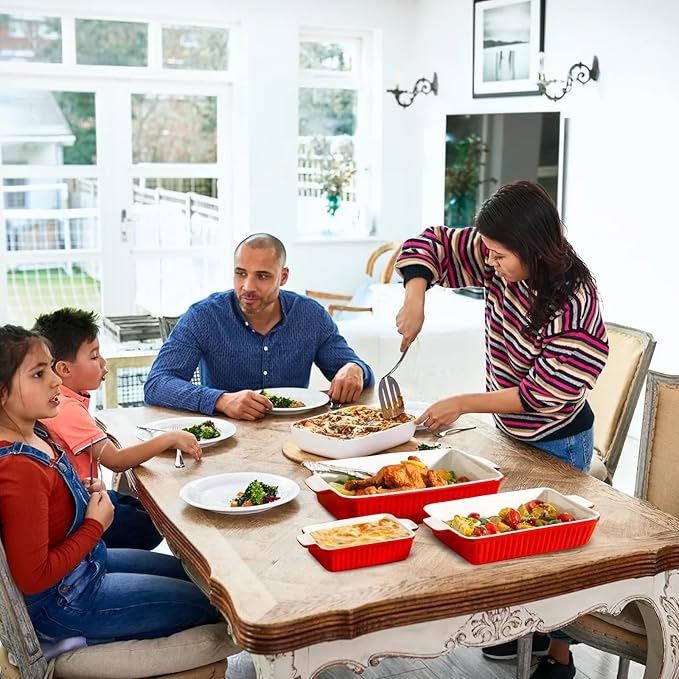 Hasense Casserole Dishes for Oven, Rectangular Baking Dishes Set of 3, Porcelain Lasagna Pans with Handles, Ceramic Baking Pans Set for Cooking, Christmas Party Birthday Gifts, Red(15"/12.2''/8.3'')