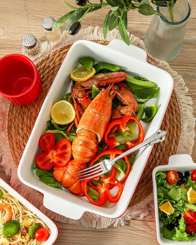 - Timeless Red Aesthetic: This set of baking dishes for oven features a classic red exterior that is elegantly simple, perfectly complementing various tableware. The dual-handle design and vertical patterns make it easier to grip