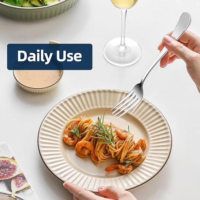 - [Ergonomic Design, Comfortable and Balanced Feel in Hand]--the curvature of fork handles is designed according to the posture of the hand, and the appropriate weight and perfect balance are added to ensure maximum comfort during use that avoids you feel tired. Moreover, the smooth edges ensure safety and no scratches.Most importantly, they're dishwasher safe.