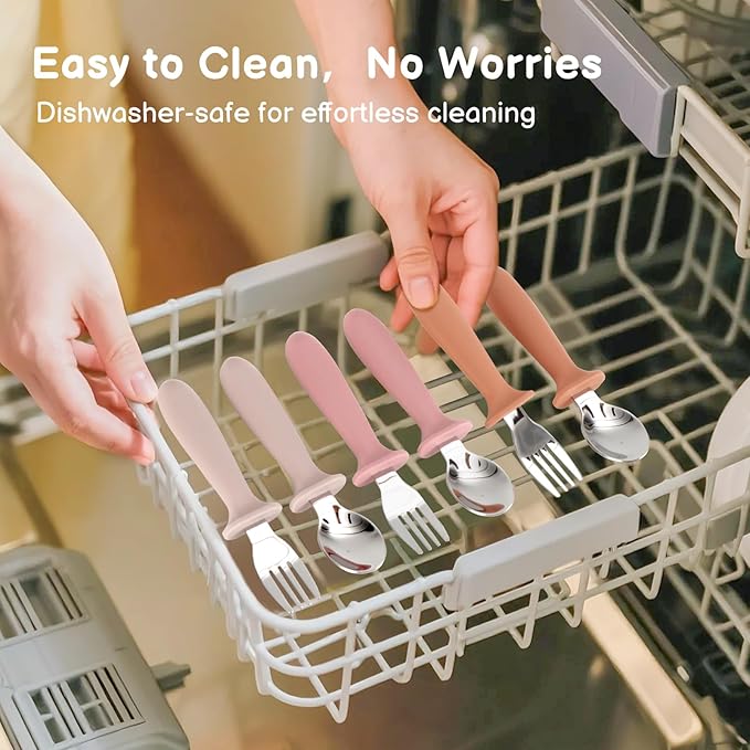 - Independent Eating: The forks and spoons silverware set thick, easy-to-grip silicone handles fit your child's small hands, and the spoon and fork are sized to hold just the right amount of food for small mouths, making it more comfortable for your child to use and encouraging your baby to eat independently.