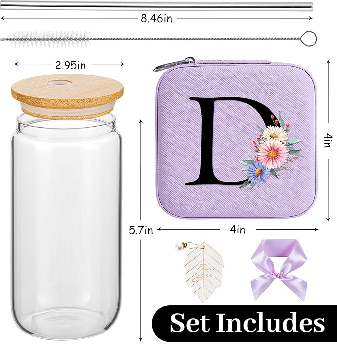 - 🌸Initial jewelry box and Glass with Bamboo Lid and Straw Set: personalized initial printed jewelry box and a 16 oz. glass with bamboo lid and straw, the jewelry box is made of high quality PU leather with eco-friendly nubuck lining, soft and luxurious, won't scratch your jewelry. jewelry box size: 3.93*3.93*1.8 inches, glass size: 2.95*5.7 inches, straw size: 2.36*8.46 inches