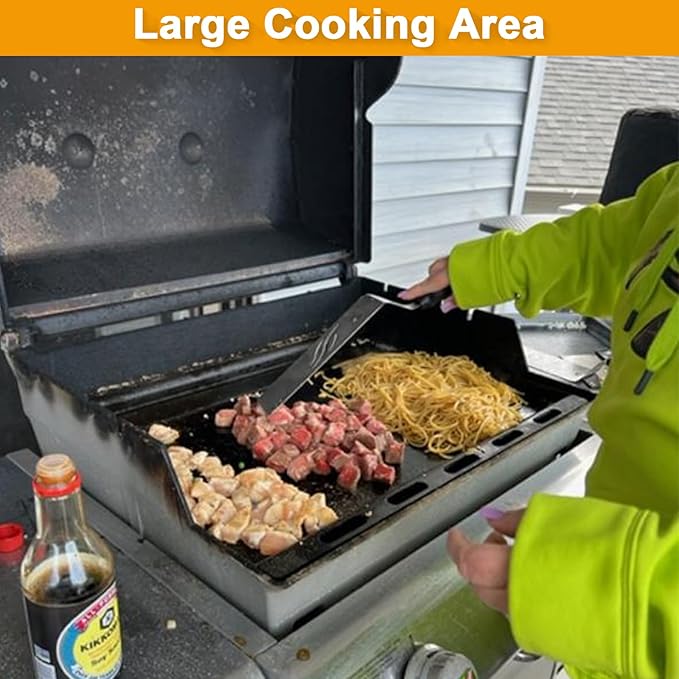 - From Grill to Griddle: Measuring approximately 25.6" x 18.7" x 1.3" , the extra-large cooking area is perfect for cooking several dishes at the same time. Make crispy burgers, bacon, eggs, fajitas and stir-fries by simply removing your existing grill and placing the griddle on top
