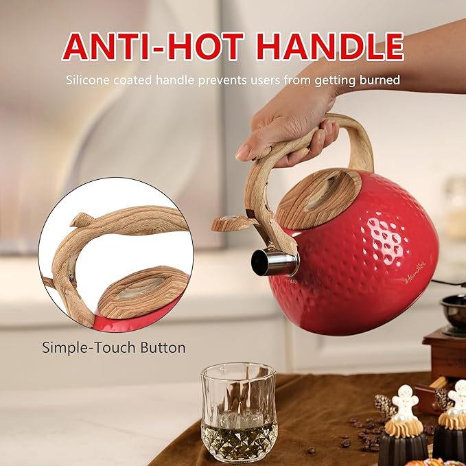 harriet Tea Kettle, Tea Pot for Stovetop, 2.5QT Whistling Kettle with 5-Layers bottom, Food Grade Stainless Steel Kettles with Hot-Resistant Handle Gas Electric Applicable, Red
