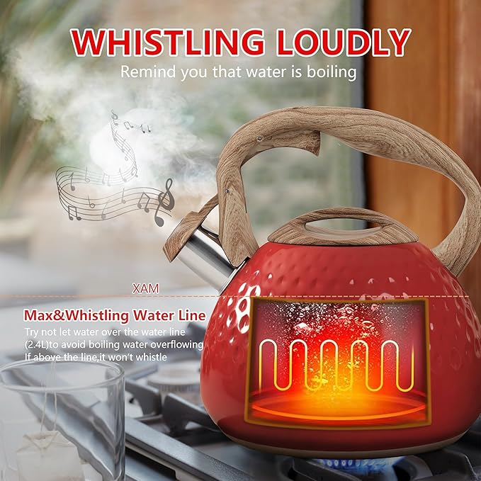 - Automatic Whistle: When the water reaches boiling point, the tea kettle emits a loud whistle to catch your attention, reminding you to turn off the heat. (Tip: Fill up to 80% of capacity to ensure the tea kettle for stovetop whistles effectively)