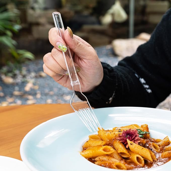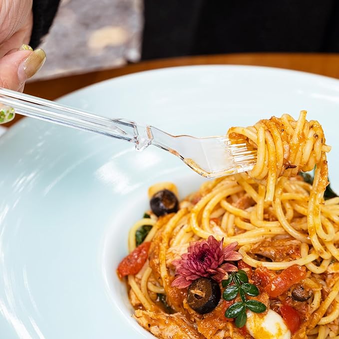 - Transparent, Clean, and High-End: Enhance the visual appeal of your table setting with these clear plastic forks that exude cleanliness, elegance, and sophistication. Whether hosting a formal event or a casual get-together, these forks complement any table decor with their sleek and upscale design, adding a touch of refinement to your dining experience.