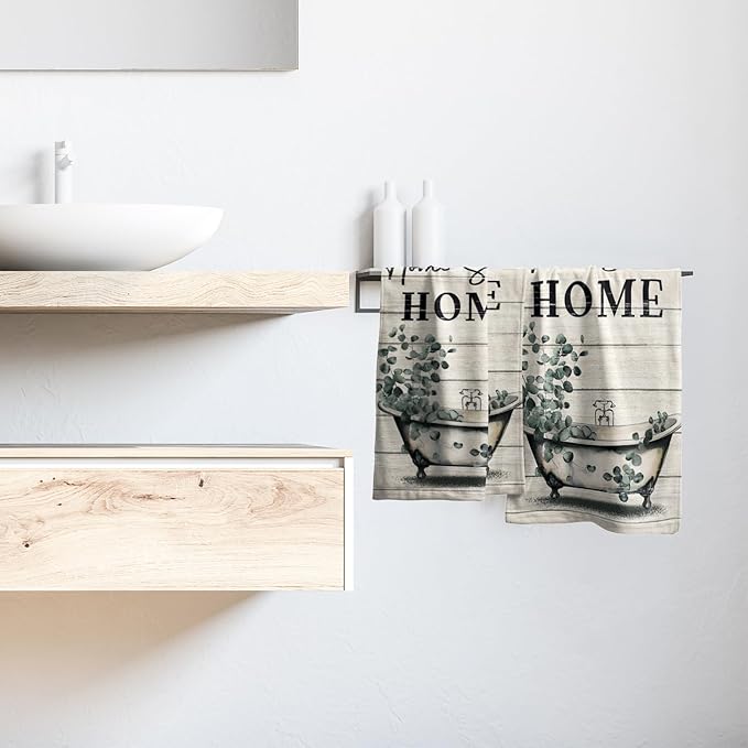 Imiss Home Sweet Home Hand Towels Set of 2 - Green Leaves Bathroom Towel 14.4 x 28.3 Inch Vintage Style Bathtub Kitchen Dishcloth Farmhouse Fingertip Towel for Gym Yoga Spa Bathroom