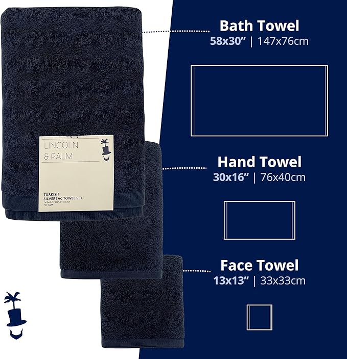 Lincoln & Palm 3 Piece Turkish Towels Set, Thick, Soft, Plush 700 GSM Spa & Hotel Quality, Silver Infused SILVERbac | Bath 58x30, Hand 30x16, Face Wash Cloth 13x13 (Navy, 3 Piece Towel Set)