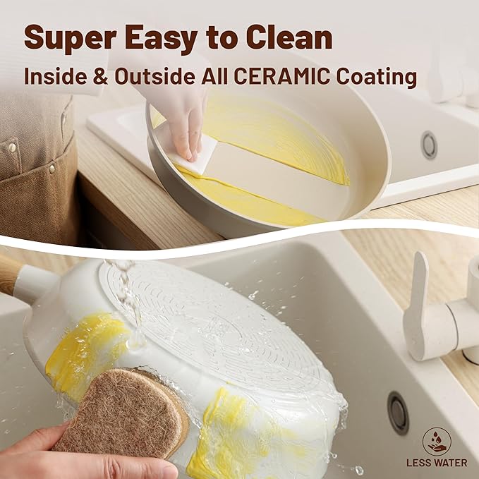 - All Ceramic Coating: Internal ceramic coating for safe,healthy and non-toxic cooking with less oil. Free of intentionally added PFAS/PTFE/PFOA/lead/cadmium. This non toxic cookware set will not produce toxic fumes even overheated. External ceramic coating ensures ease of cleaning and greater stain resistance.