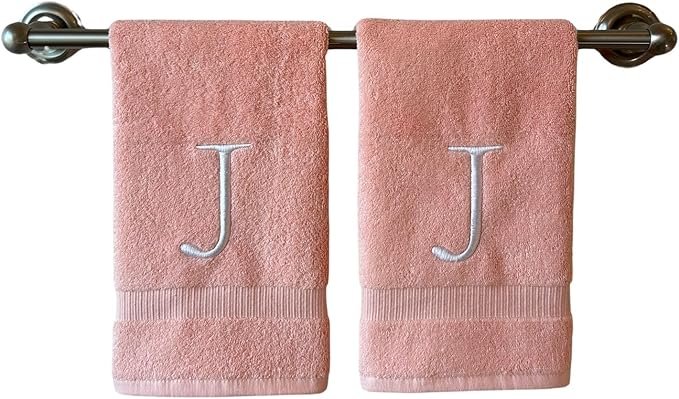 Pink Initial Hand Towel for Bathroom - Monogrammed Luxury Hotel Quality Decorative Embroidered Towel for Powder Room, Spa - GOTS Organic Certified - Set of 2 Letter J
