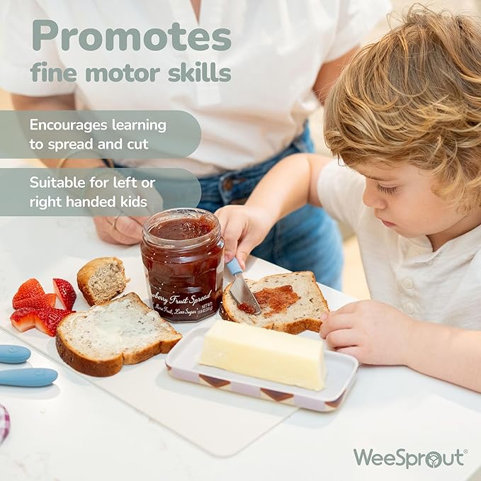 - COMPLETE SET: Includes 2 perfectly sized knives, 2 forks, and 2 spoons, with each set featuring two unique colors. This complete set allows children to practice all aspects of dining. The appropriately sized forks and spoons bridge the gap between toddler and adult utensils, while the knives are ideal for spreading and learning basic cutting skills, helping children develop confidence with all utensils during mealtimes.