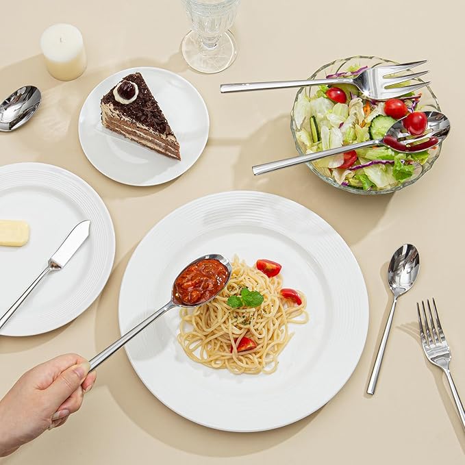 - SILVERWARE SET INCLUDES: 45-piece flatware set includes 8 dinner knife (8.92 inch/2.75 oz) , 8 dinner fork (8.31 inch/2.07 oz), 8 dinner spoon (8.11inch/2.64 oz), 8 salad fork (7.01 inch/1.41 oz)and 8 teaspoon (6.9 inch/1.63 oz), and the hostess set (1 serving spoon, 1 serving sork, 1 sutter snife, 1 slotted serving spoon, 1 sugar spoon), service for 8
