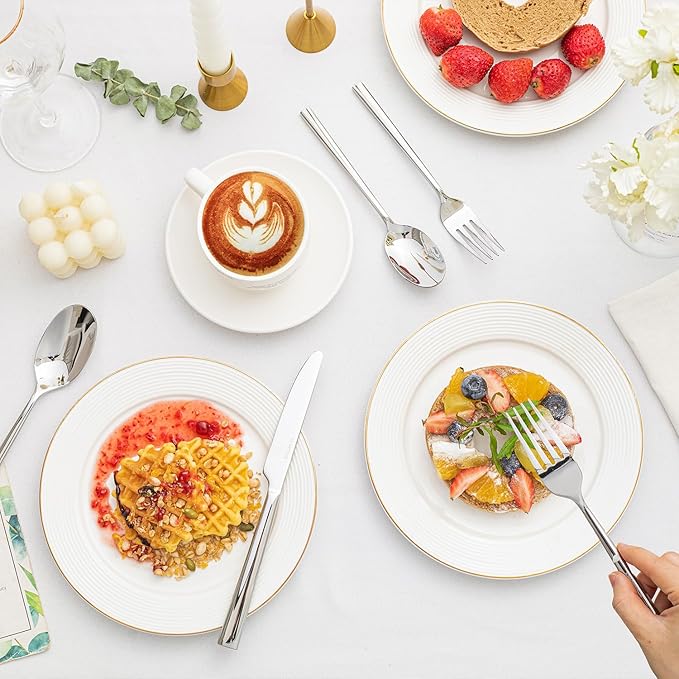 - DESIGN AND APPEARANCE: Mirror finish, natural and elegant design.Smooth and silk surface without grain, easy to clean and care in daily use. Crafted forged process,strong and durable,so that the flatware set has a thicker texture